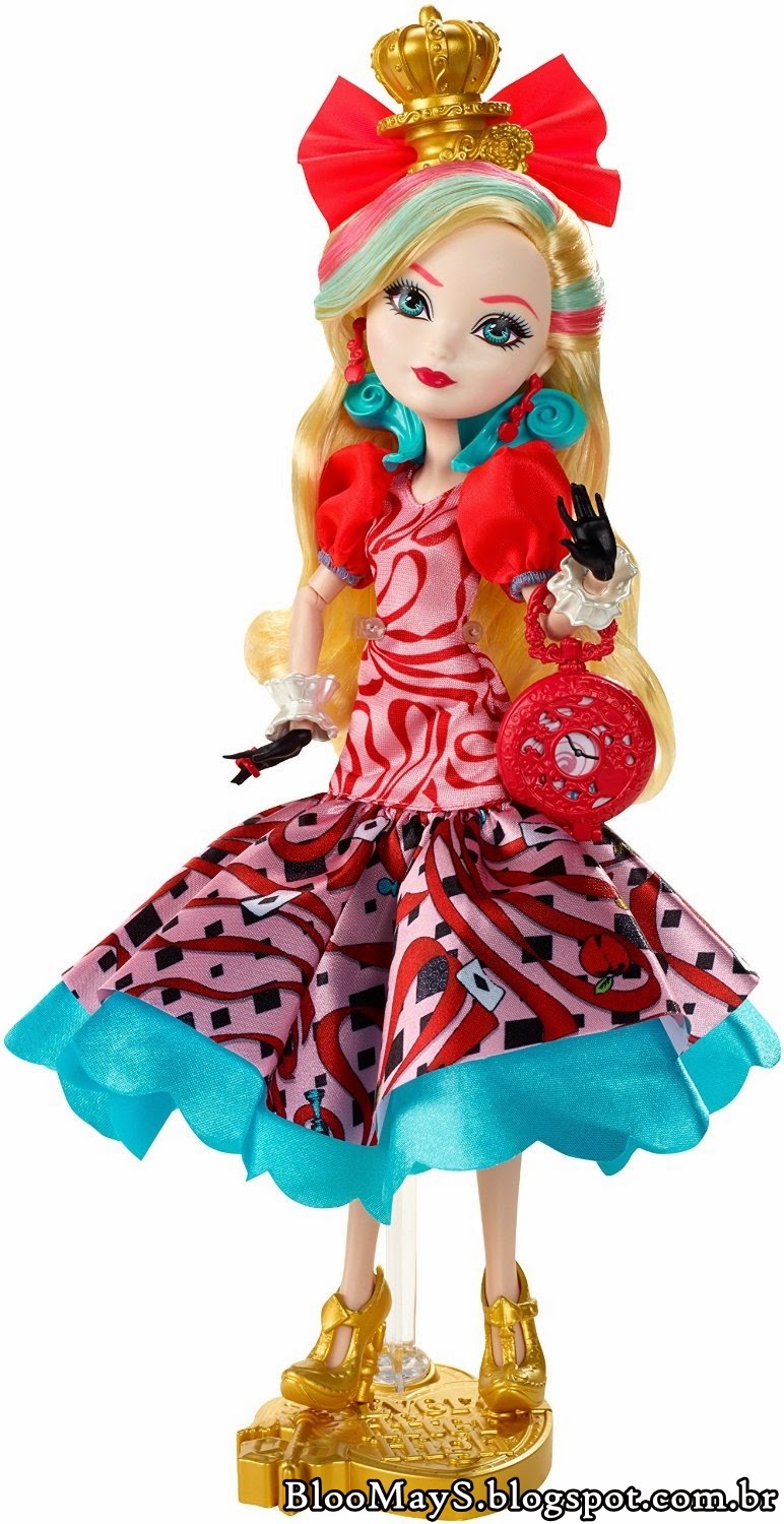 A primeira é a Elissabat! Embora seja uma boneca bem simplesinha, ela é super adorável! O vermelho combinou bem com o roxo, e eu amei o vestido estampado! Porém eu preferia que o sapato fosse mais colorido. Detesto sapatos vermelhos sem mais nenhuma cor secundária.